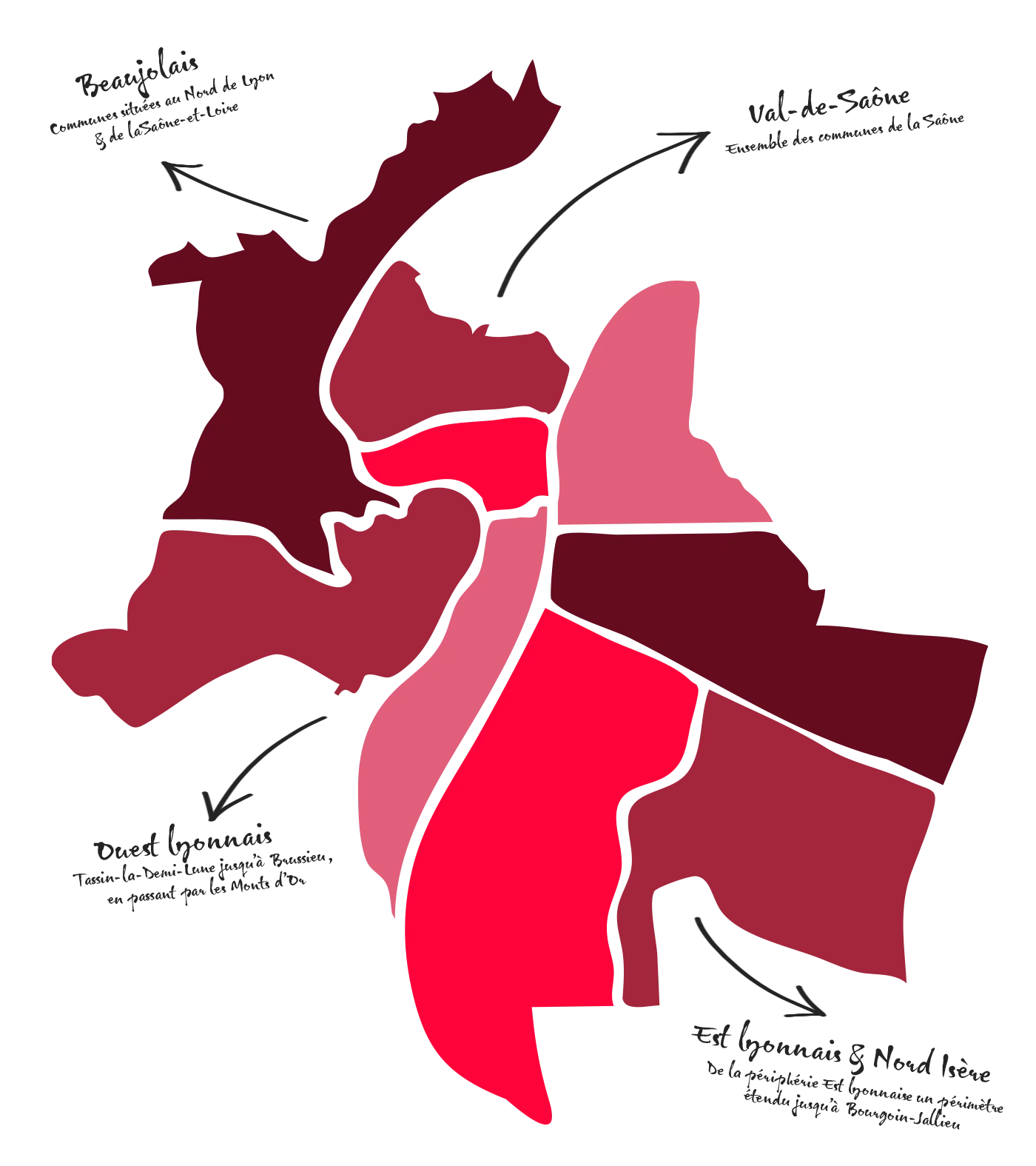 la Presqu’île, les 9 arrondissements de Lyon et l’ensemble des communes limitrophes de la métropole lyonnaise.